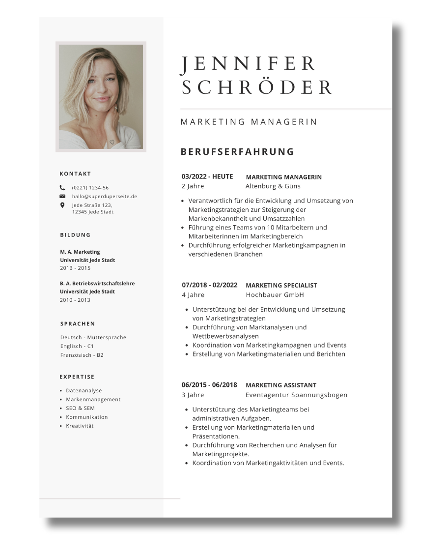 Please upload your text, photo, or old CV here after placing your order, so that we can create your new CV for you. You can also enter any special requests in the text field. Once the CV has been completed, you will receive your new CV as a PDF for download.